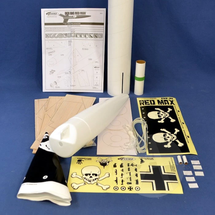 The Der Big Red Max is the latest in a long line of rockets by a similar name from Estes Industries. They all feature the same style of art, and a theme that seems akin to the Red Baron, however this is the first of these to feature a 3″ airframe, 29mm motor motor mount, and capable of mid-power motors.