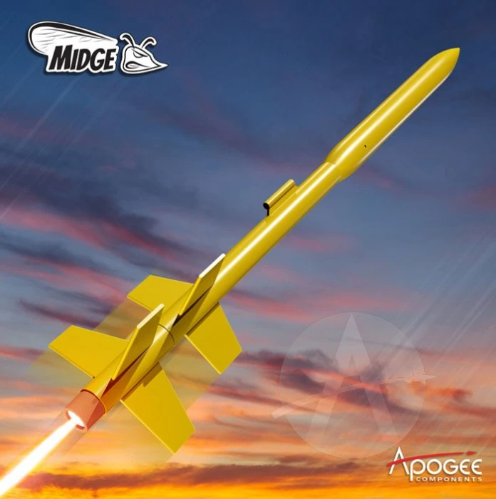 The Midge was specifically designed for the NAR’s “Payload Altitude” contest event, but it can be flown just for fun too. It is a two-stage rocket designed to carry both a small altimeter and the 28-gram NAR Standard Payload weight.