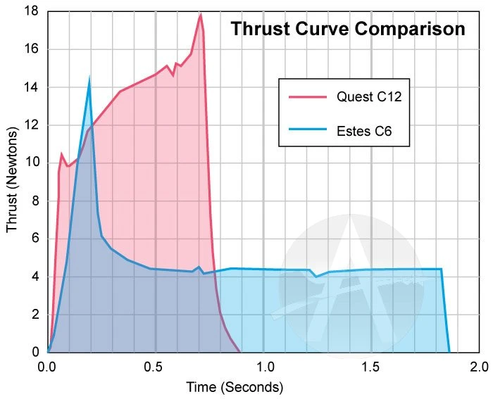 The Quest C12-8 is a great all-around motor for your typical rockets. It is particularly suited for lightweight rockets where you want to cause whiplash among spectators. It features composite propellant, which has twice the energy as a black powder motor. Same size and diameter as an Estes motor, so it fits all your favorite rockets. But this is for single-stage rockets only, as it cannot be staged.