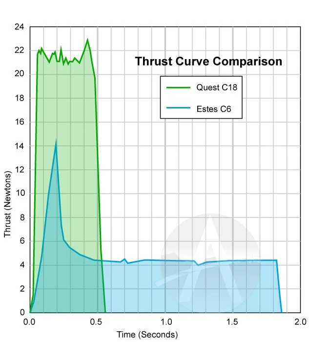 The Quest C18-6 is a great all-around motor for your typical rockets. It is particularly suited for heavier or larger diameter rockets. It features composite propellant, which has twice the energy as a black powder motor. Same size and diameter as an Estes motor, so it fits all your favorite rockets. But this is for single-stage rockets only, as it cannot be staged.