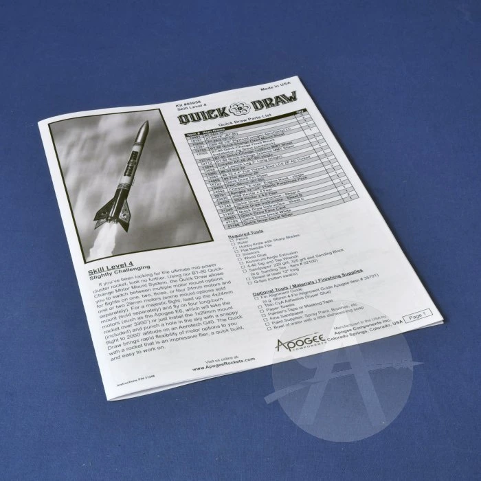 The Quick Draw is a rocket that gives you options. Fly it simply with a single 29mm motor, or thrill the crowds with a cluster flight on three roaring 24mm composite motors. You decide, at the field. And, you can change back anytime you like.